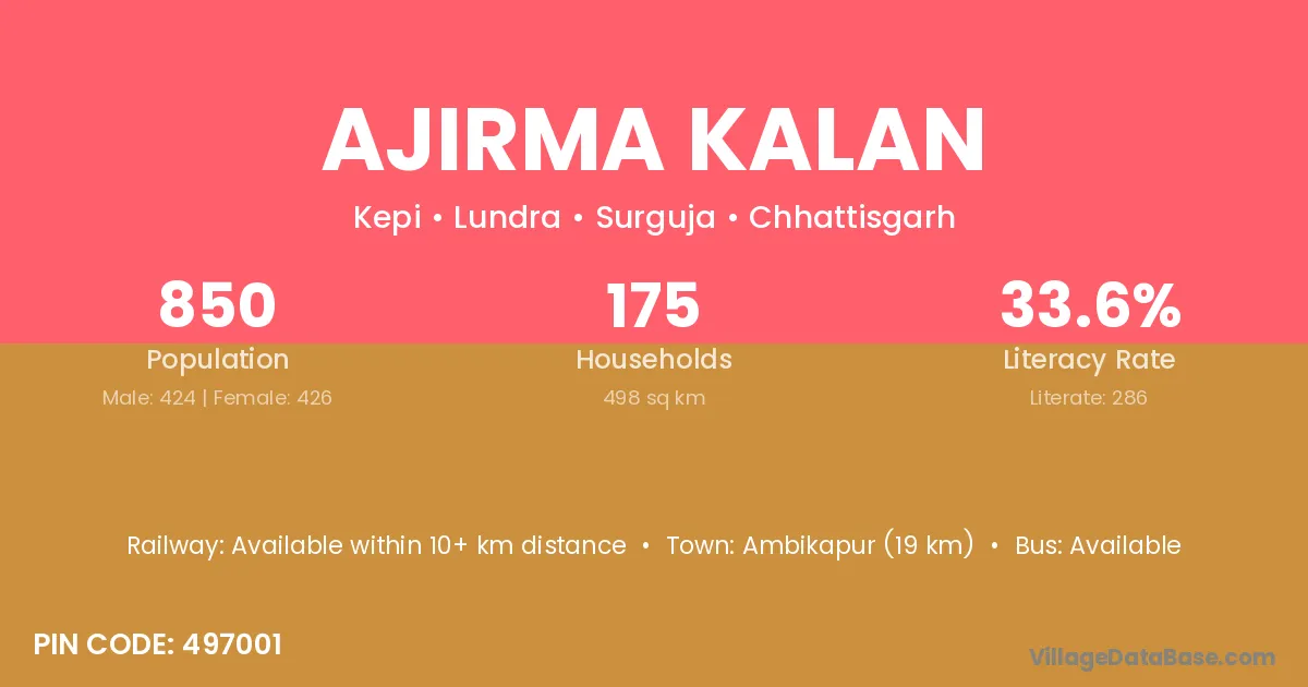 Ambikapur (19 km) is the nearest town to Ajirma Kalan village for major economic activities and is located approximately 19 km away.