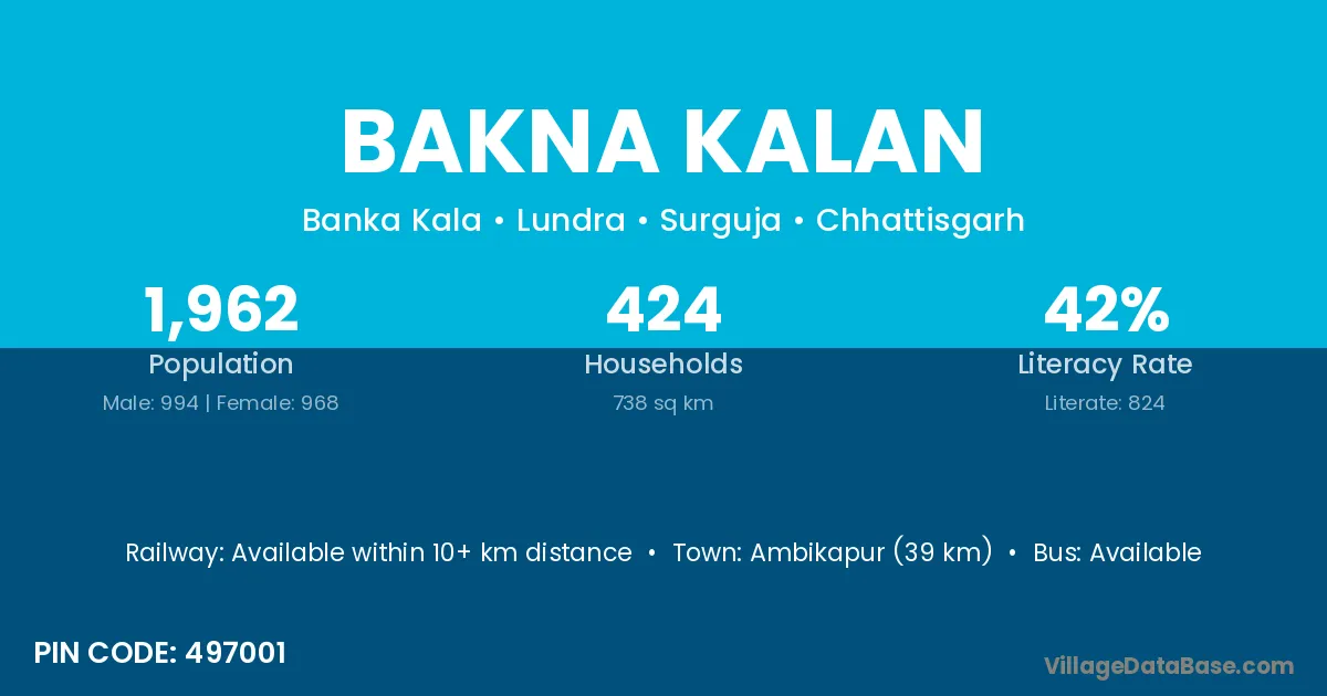 Ambikapur (39 km) is the nearest town to Bakna Kalan village for major economic activities and is located approximately 39 km away.