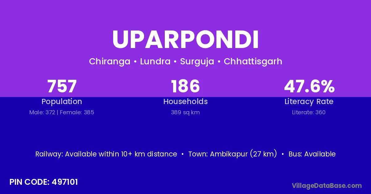 Ambikapur (27 km) is the nearest town to Uparpondi village for major economic activities and is located approximately 27 km away.