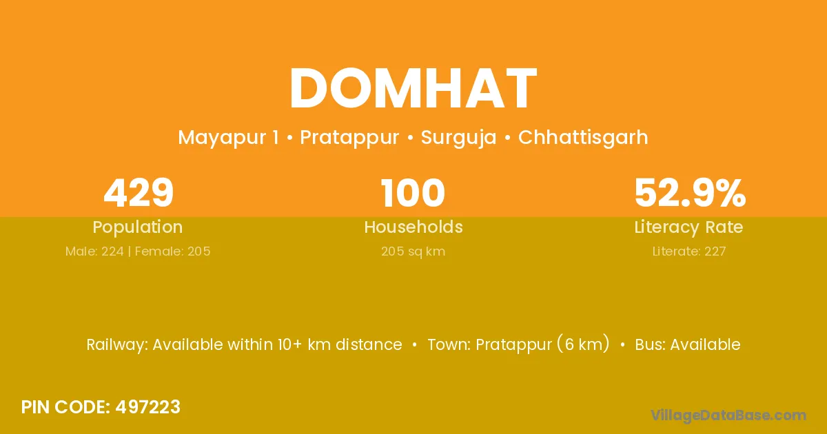Pratappur (6 km) is the nearest town to Domhat village for major economic activities and is located approximately 6 km away.