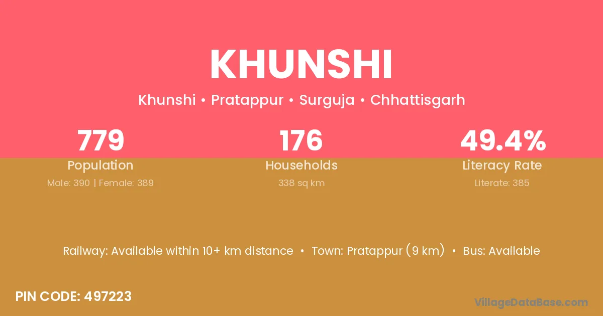 Khunshi village has a total population of 779 people, of which 390 are males and 389 are females.