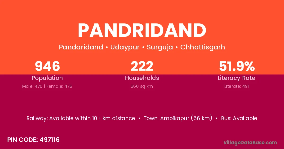 Ambikapur (33 km) is the nearest town to Pandridand village for major economic activities and is located approximately 33 km away.