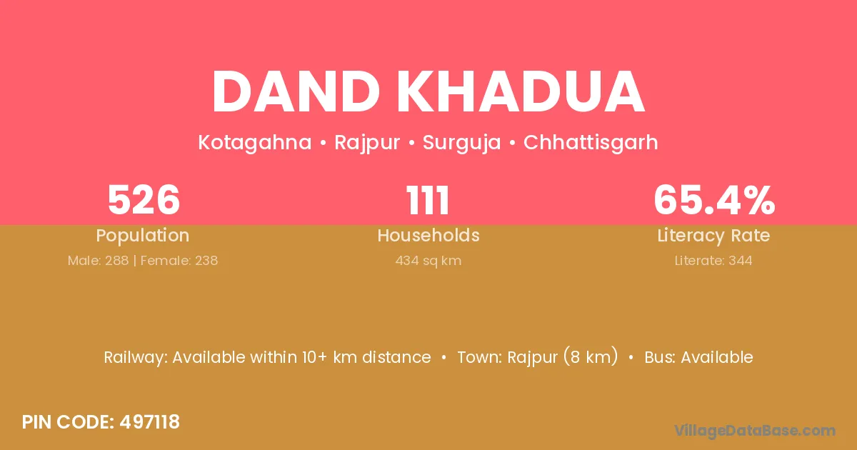 According to Census 2011 information, the village code of Dand Khadua village is 497118.