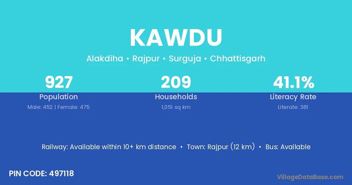 Kawdu village has a total population of 927 people, of which 452 are males and 475 are females.