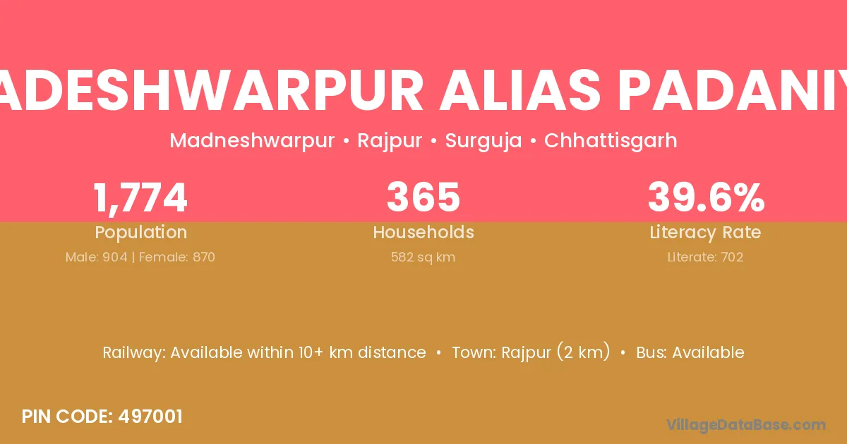 According to Census 2011 information, the village code of Madeshwarpur Alias Padaniya village is 497001.