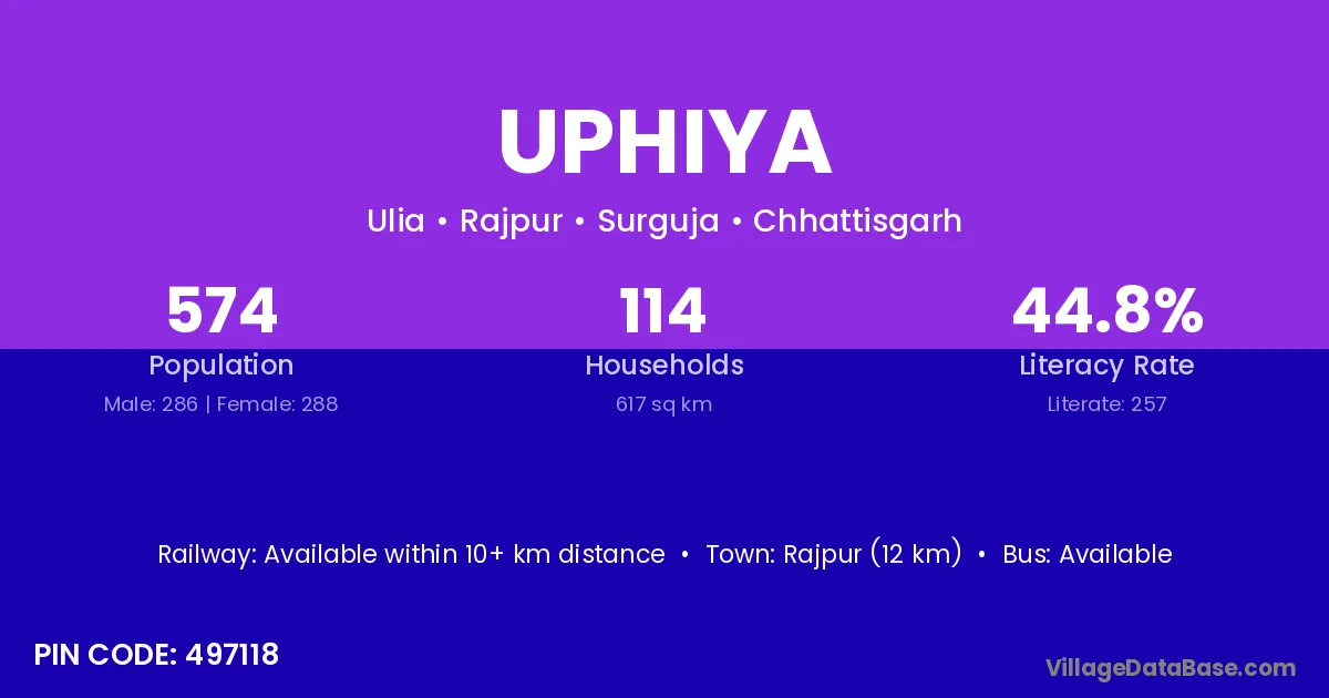 According to Census 2011 information, the village code of Uphiya village is 497118.