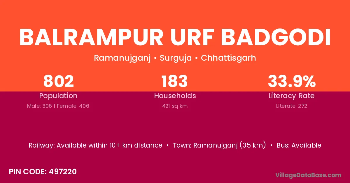 Ramanujganj (35 km) is the nearest town to Balrampur Urf Badgodi village for major economic activities and is located approximately 35 km away.