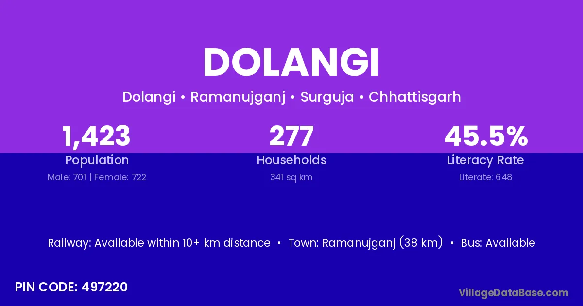 Ramanujganj (38 km) is the nearest town to Dolangi village for major economic activities and is located approximately 38 km away.