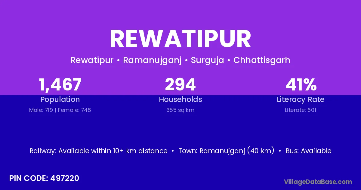 Ramanujganj (40 km) is the nearest town to Rewatipur village for major economic activities and is located approximately 40 km away.
