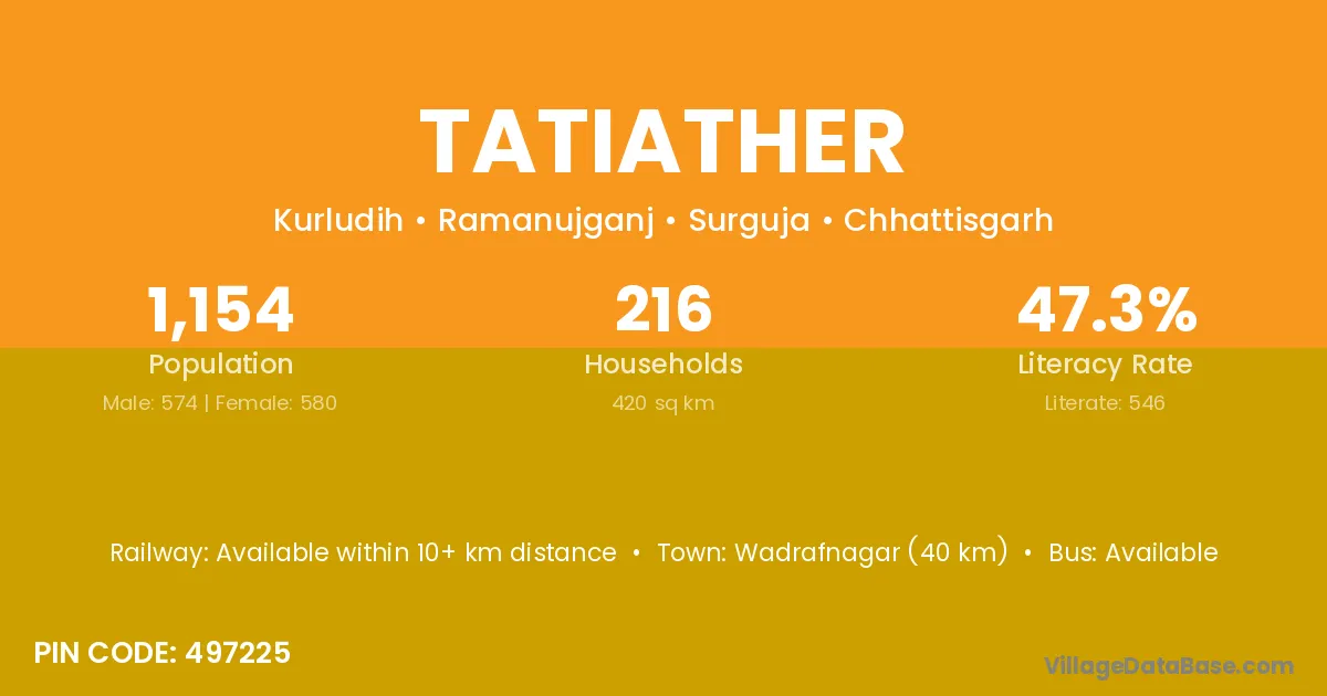 Wadrafnagar (40 km) is the nearest town to Tatiather village for major economic activities and is located approximately 40 km away.