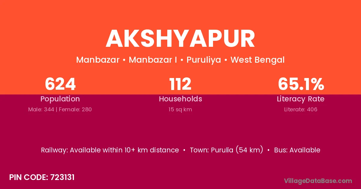 Surajpur (30 km) is the nearest town to Akshyapur village for major economic activities and is located approximately 30 km away.