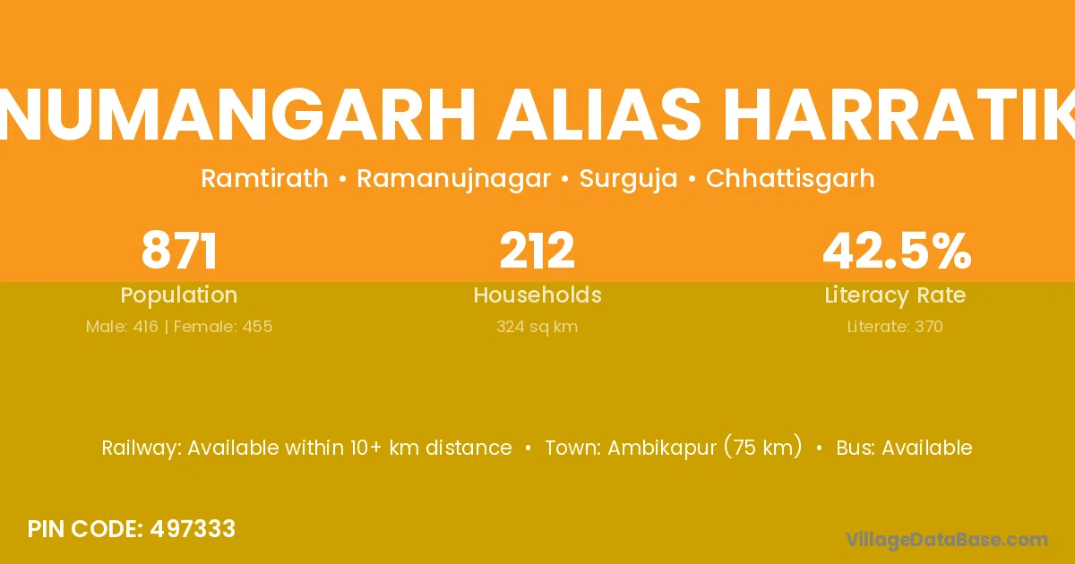 Hanumangarh Alias Harratikra village has a total population of 871 people, of which 416 are males and 455 are females.