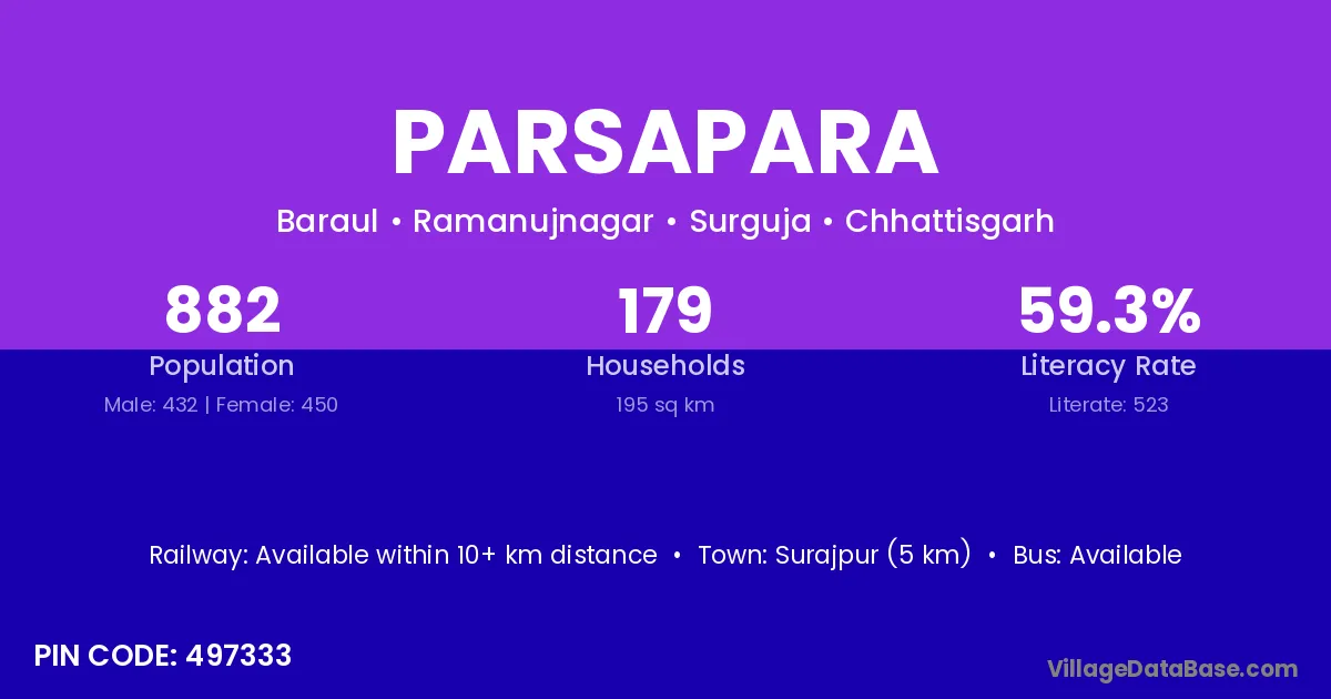 Surajpur (5 km) is the nearest town to Parsapara village for major economic activities and is located approximately 5 km away.