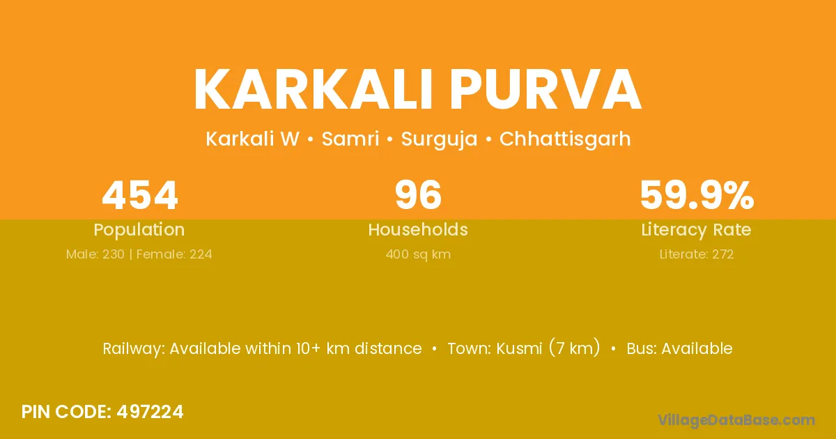 Karkali Purva village has a total population of 454 people, of which 230 are males and 224 are females.