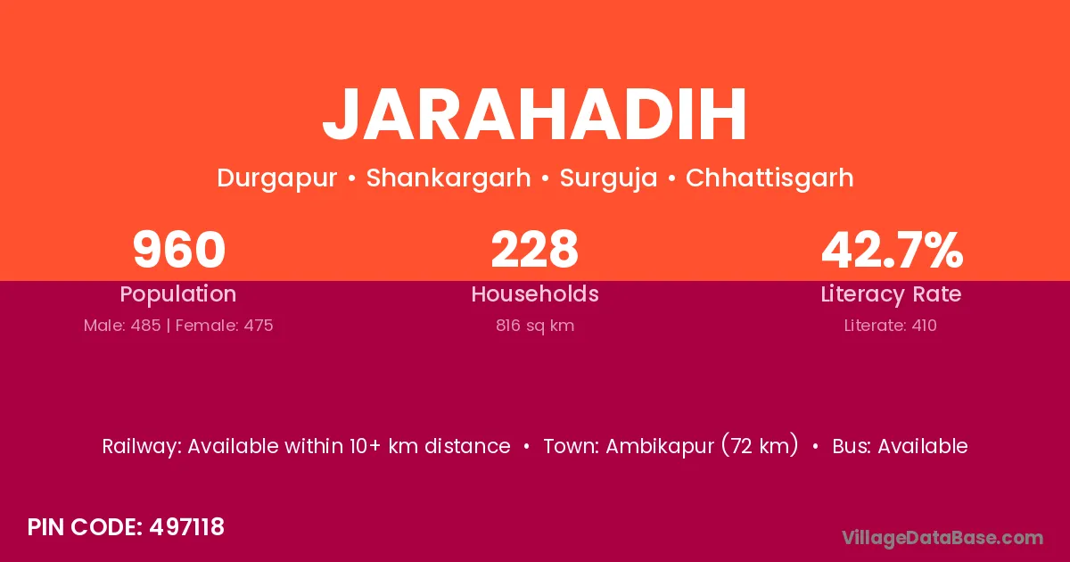 Ambikapur (72 km) is the nearest town to Jarahadih village for major economic activities and is located approximately 72 km away.