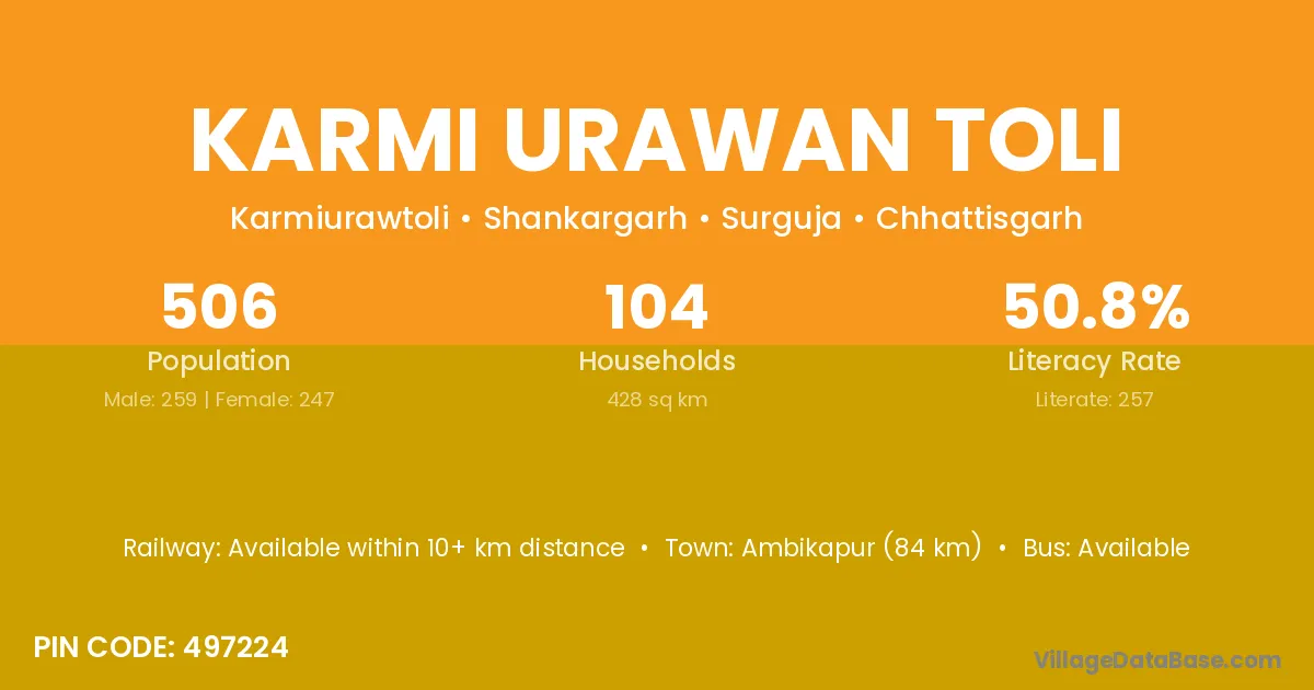Ambikapur (84 km) is the nearest town to Karmi Urawan Toli village for major economic activities and is located approximately 84 km away.