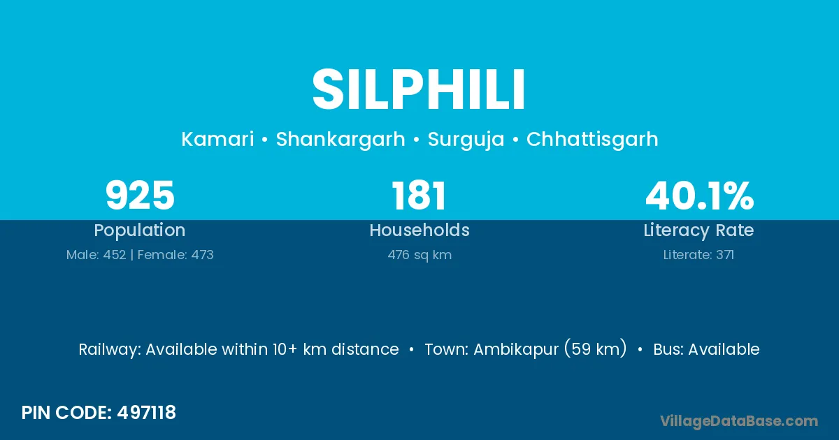 Ambikapur (59 km) is the nearest town to Silphili village for major economic activities and is located approximately 59 km away.