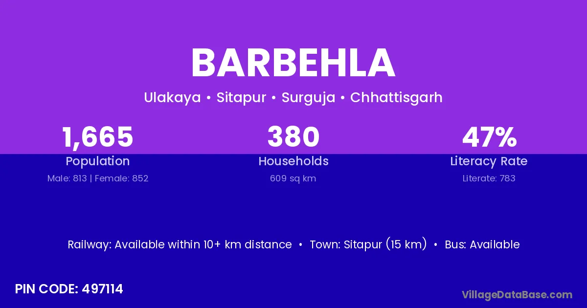 Sitapur (15 km) is the nearest town to Barbehla village for major economic activities and is located approximately 15 km away.