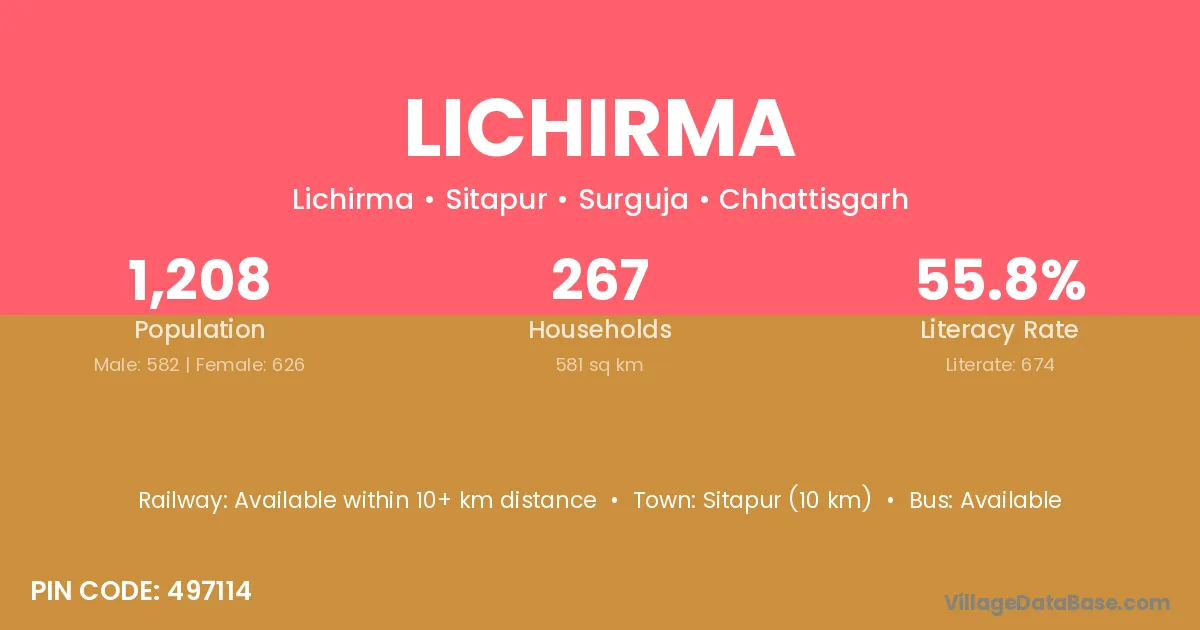 Lichirma village has a total population of 1,208 people, of which 582 are males and 626 are females.