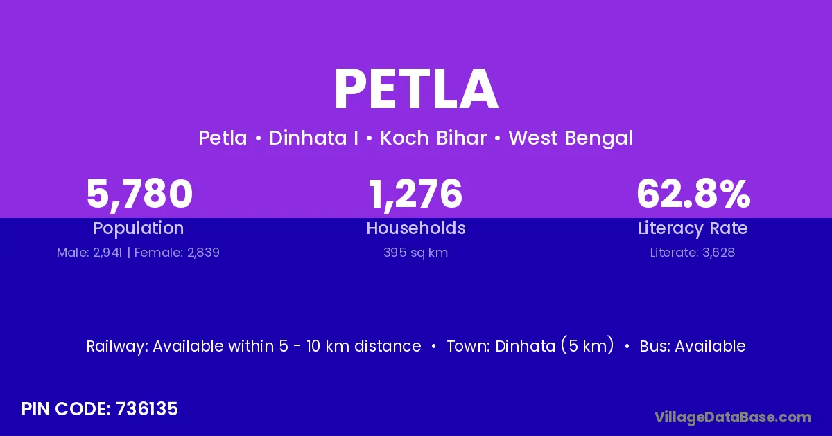 Sitapur (15 km) is the nearest town to Petla village for major economic activities and is located approximately 15 km away.