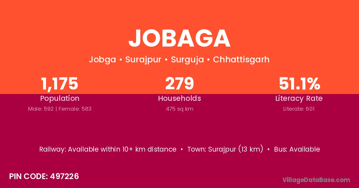 Surajpur (13 km) is the nearest town to Jobaga village for major economic activities and is located approximately 13 km away.