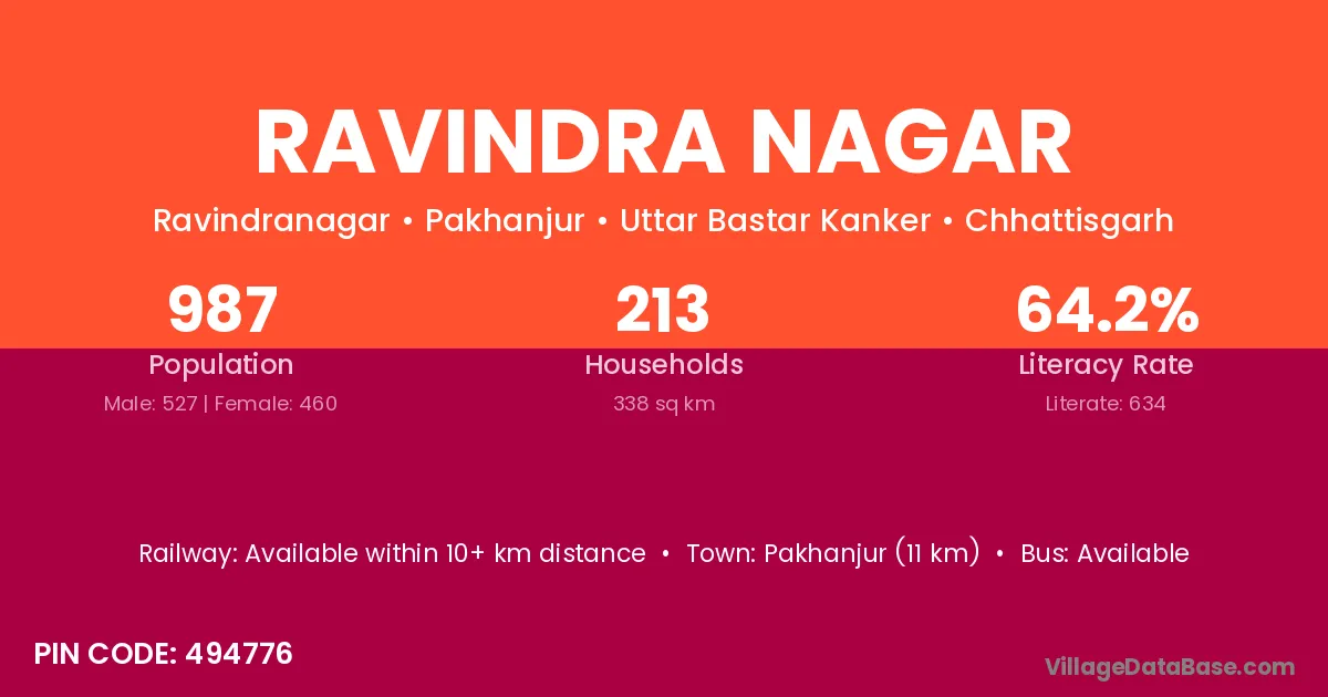 Ambikapur (9 km) is the nearest town to Ravindra Nagar village for major economic activities and is located approximately 9 km away.