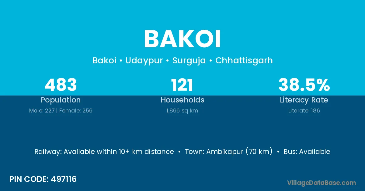 Ambikapur (70 km) is the nearest town to Bakoi village for major economic activities and is located approximately 70 km away.