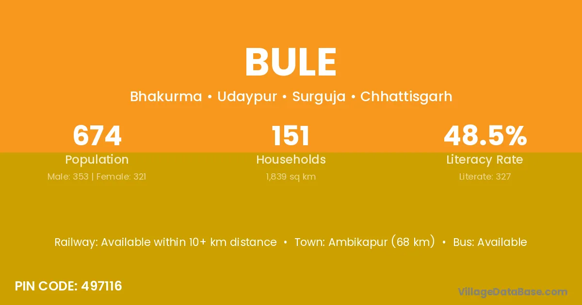 Ambikapur (68 km) is the nearest town to Bule village for major economic activities and is located approximately 68 km away.