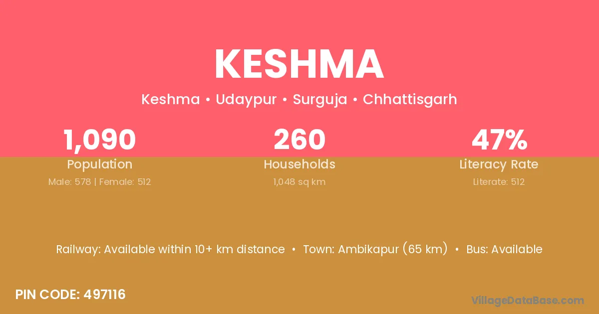 Ambikapur (65 km) is the nearest town to Keshma village for major economic activities and is located approximately 65 km away.