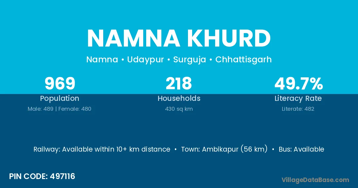 Ambikapur (56 km) is the nearest town to Namna Khurd village for major economic activities and is located approximately 56 km away.