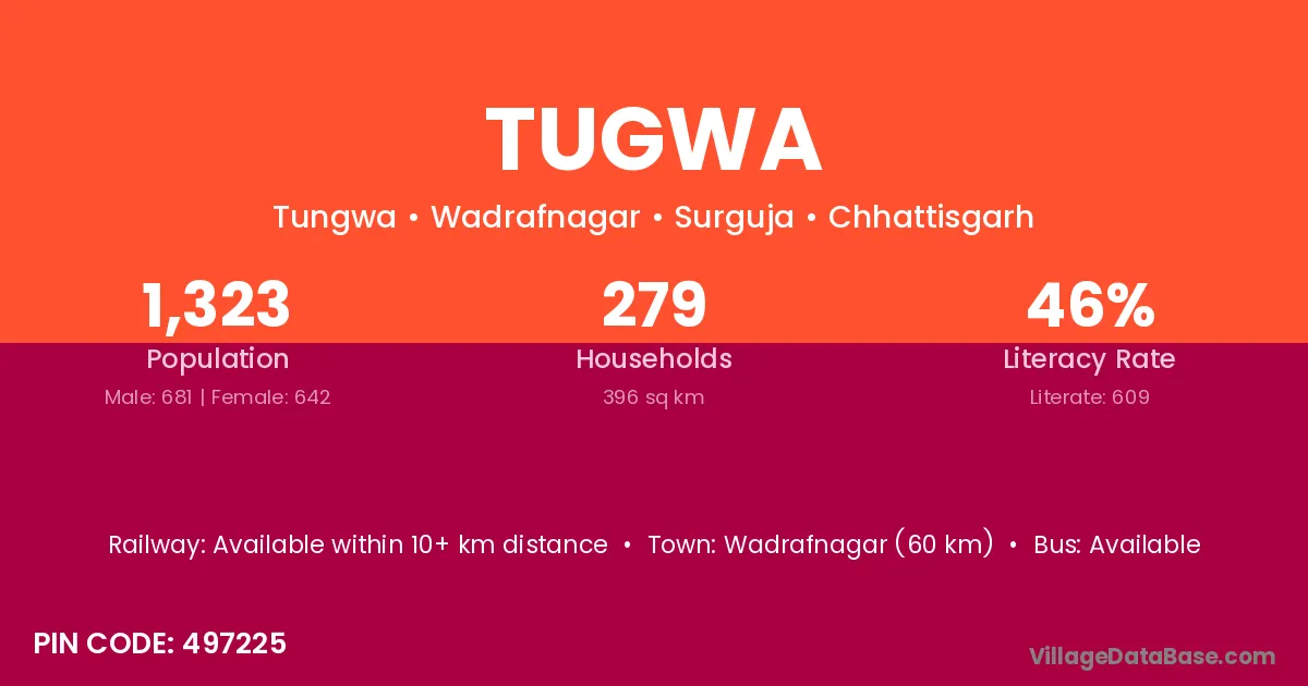 Wadrafnagar (60 km) is the nearest town to Tugwa village for major economic activities and is located approximately 60 km away.