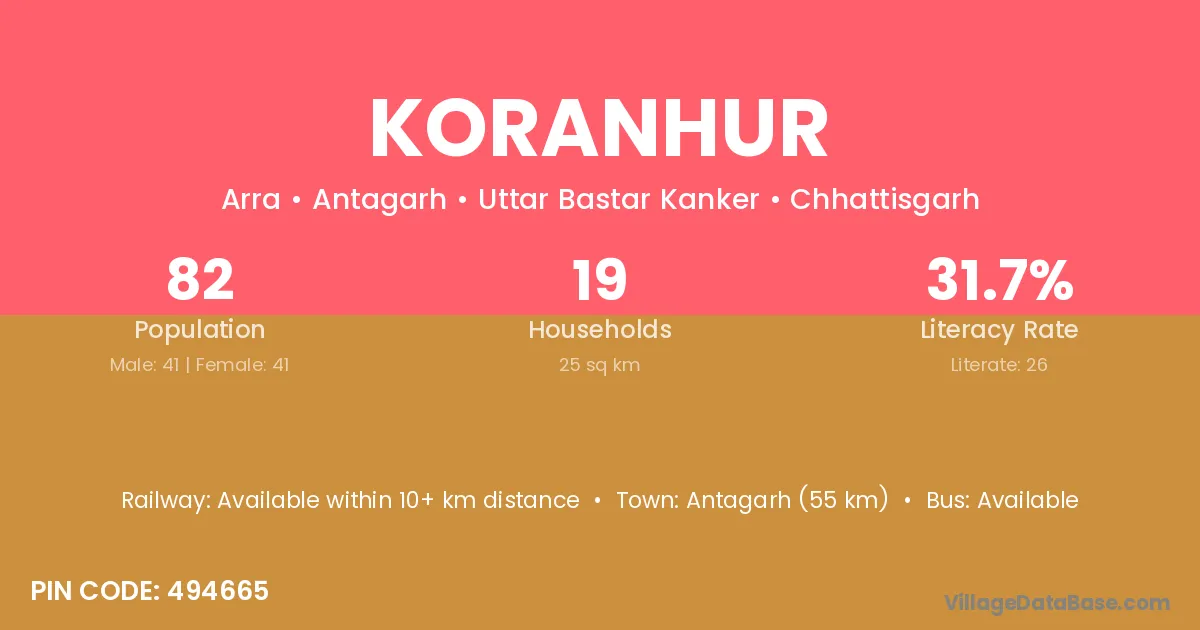 Koranhur village has a total population of 82 people, of which 41 are males and 41 are females.