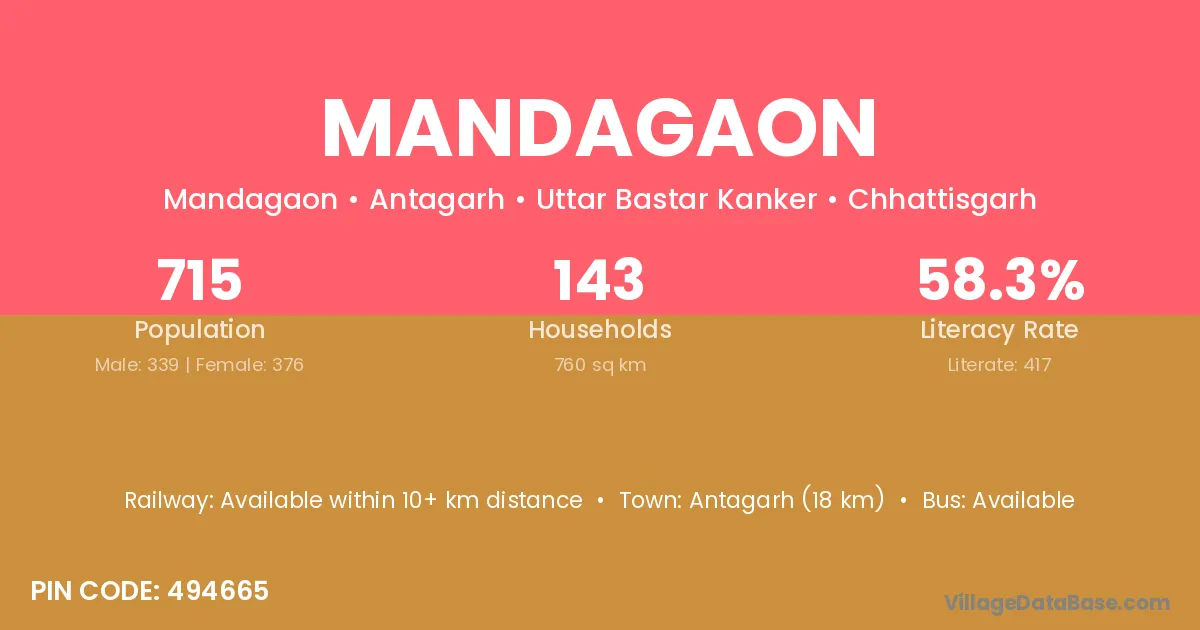 Mandagaon village has a total population of 715 people, of which 339 are males and 376 are females.