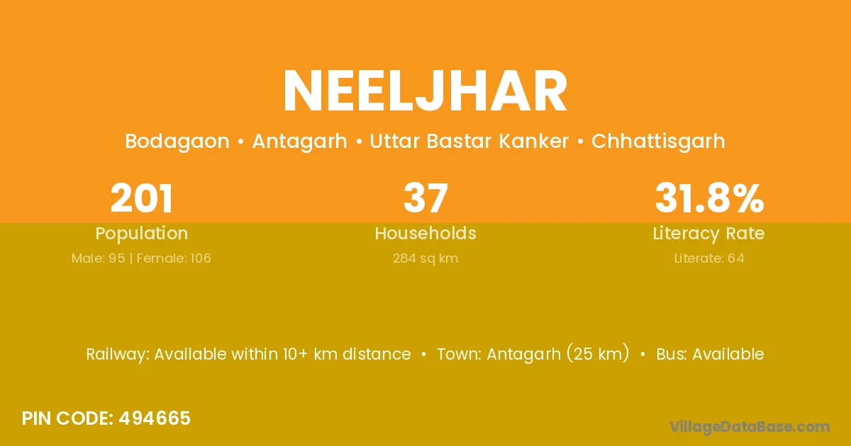 Neeljhar village has a total population of 201 people, of which 95 are males and 106 are females.