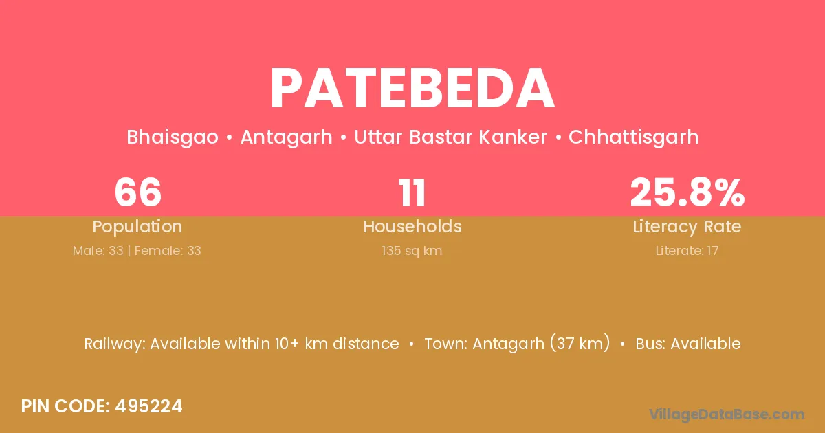 Patebeda village has a total population of 66 people, of which 33 are males and 33 are females.