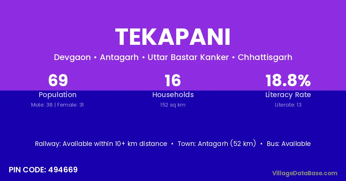 According to Census 2011 information, the village code of Tekapani village is 494669.
