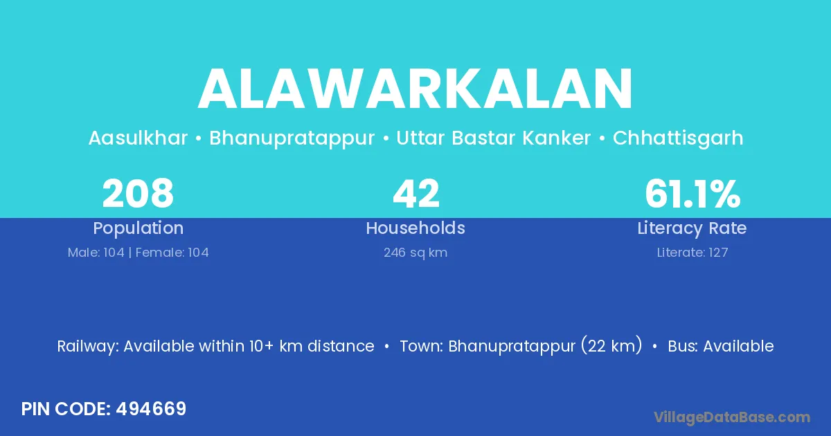 Bhanupratappur (22 km) is the nearest town to Alawarkalan village for major economic activities and is located approximately 22 km away.