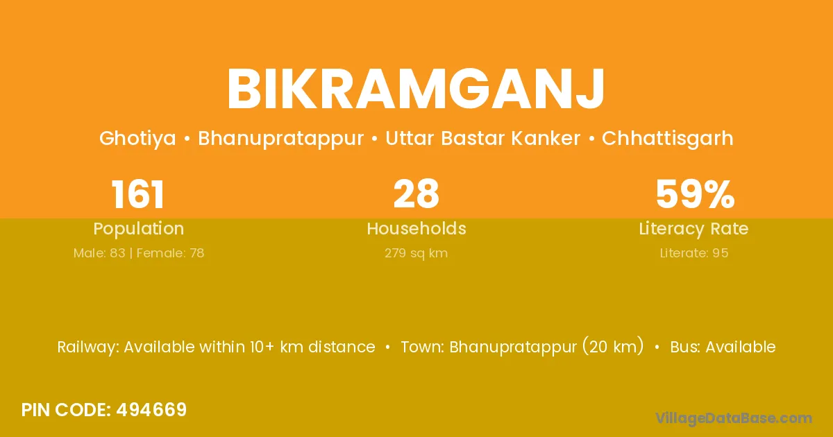 Bhanupratappur (20 km) is the nearest town to Bikramganj village for major economic activities and is located approximately 20 km away.