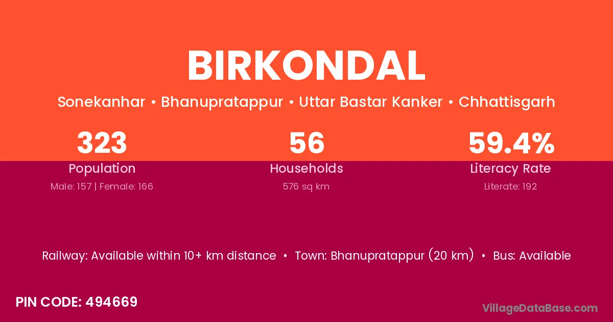 Bhanupratappur (20 km) is the nearest town to Birkondal village for major economic activities and is located approximately 20 km away.