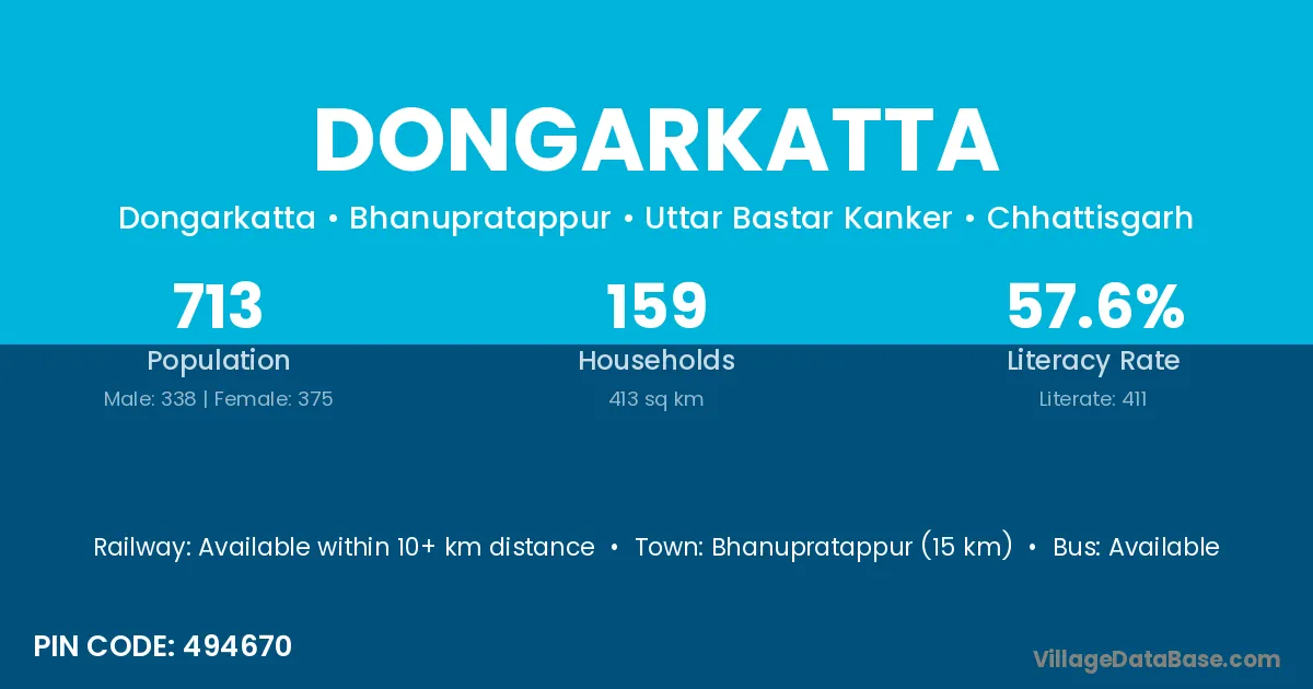 Bhanupratappur (15 km) is the nearest town to Dongarkatta village for major economic activities and is located approximately 15 km away.
