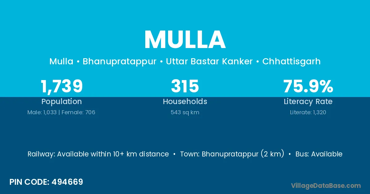 Bhanupratappur (2 km) is the nearest town to Mulla village for major economic activities and is located approximately 2 km away.