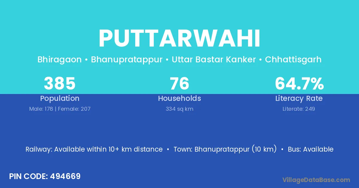 Bhanupratappur (10 km) is the nearest town to Puttarwahi village for major economic activities and is located approximately 10 km away.