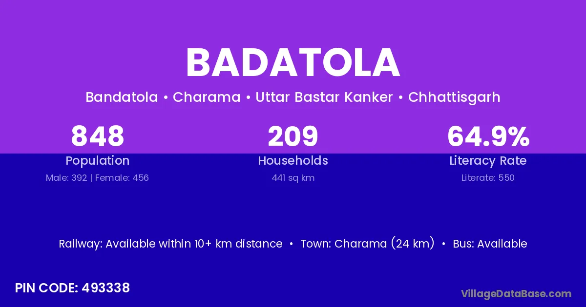 Charama (24 km) is the nearest town to Badatola village for major economic activities and is located approximately 24 km away.