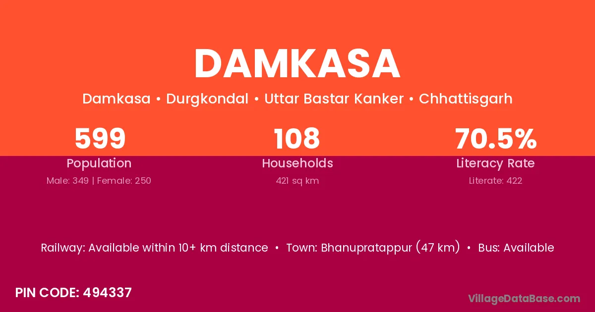 Charama (10 km) is the nearest town to Damkasa village for major economic activities and is located approximately 10 km away.