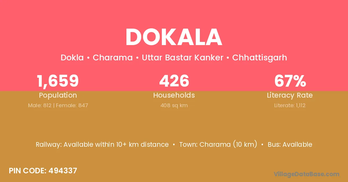 Charama (10 km) is the nearest town to Dokala village for major economic activities and is located approximately 10 km away.
