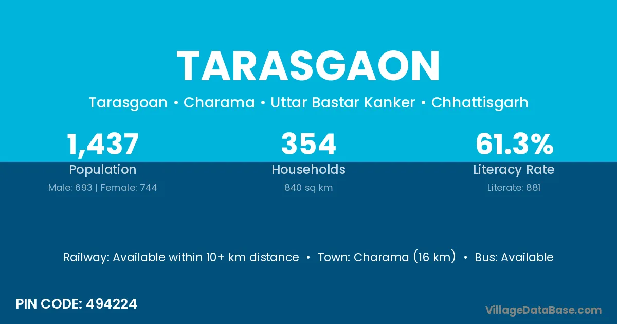 According to Census 2011 information, the village code of Tarasgaon village is 494224.