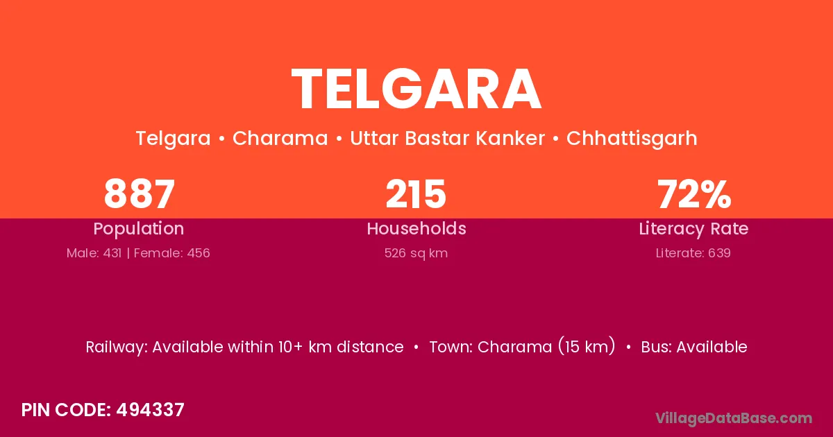 Charama (15 km) is the nearest town to Telgara village for major economic activities and is located approximately 15 km away.