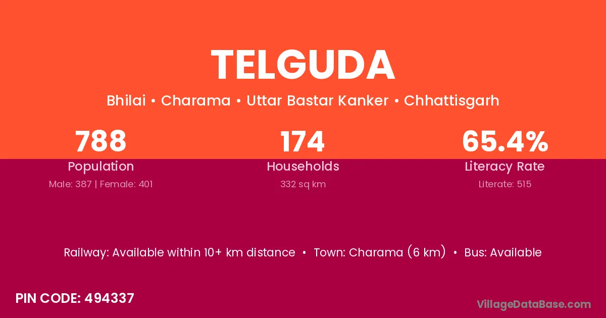 Charama (6 km) is the nearest town to Telguda village for major economic activities and is located approximately 6 km away.