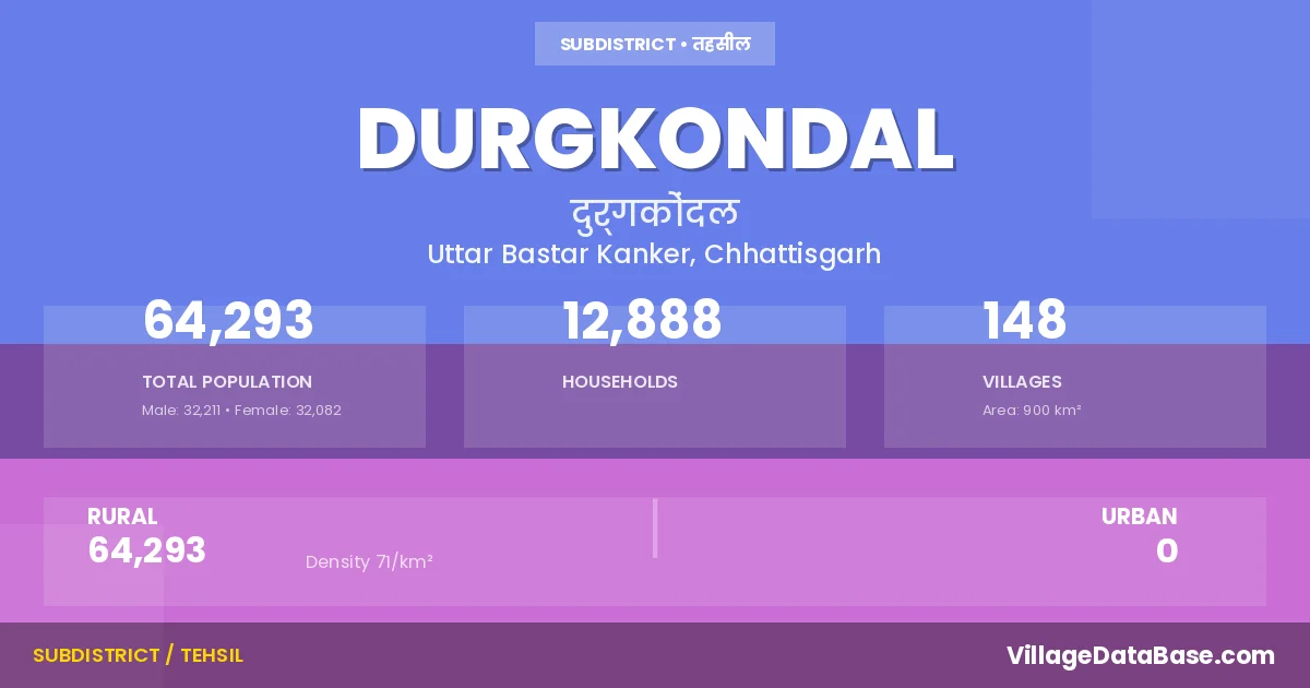 Durgkondal is a town and Tehsil in the Uttar Bastar Kanker district of the Chhattisgarh. In India, a Tehsil is a subdivision of a district responsible for the administration and revenue collection of a specific area within the district. Tehsils play a crucial role in the local governance structure, contributing significantly to the development and administration of their communities.