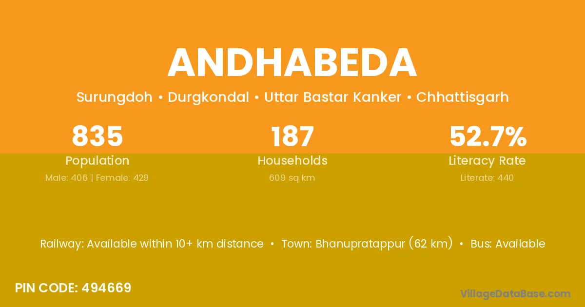 Bhanupratappur (62 km) is the nearest town to Andhabeda village for major economic activities and is located approximately 62 km away.